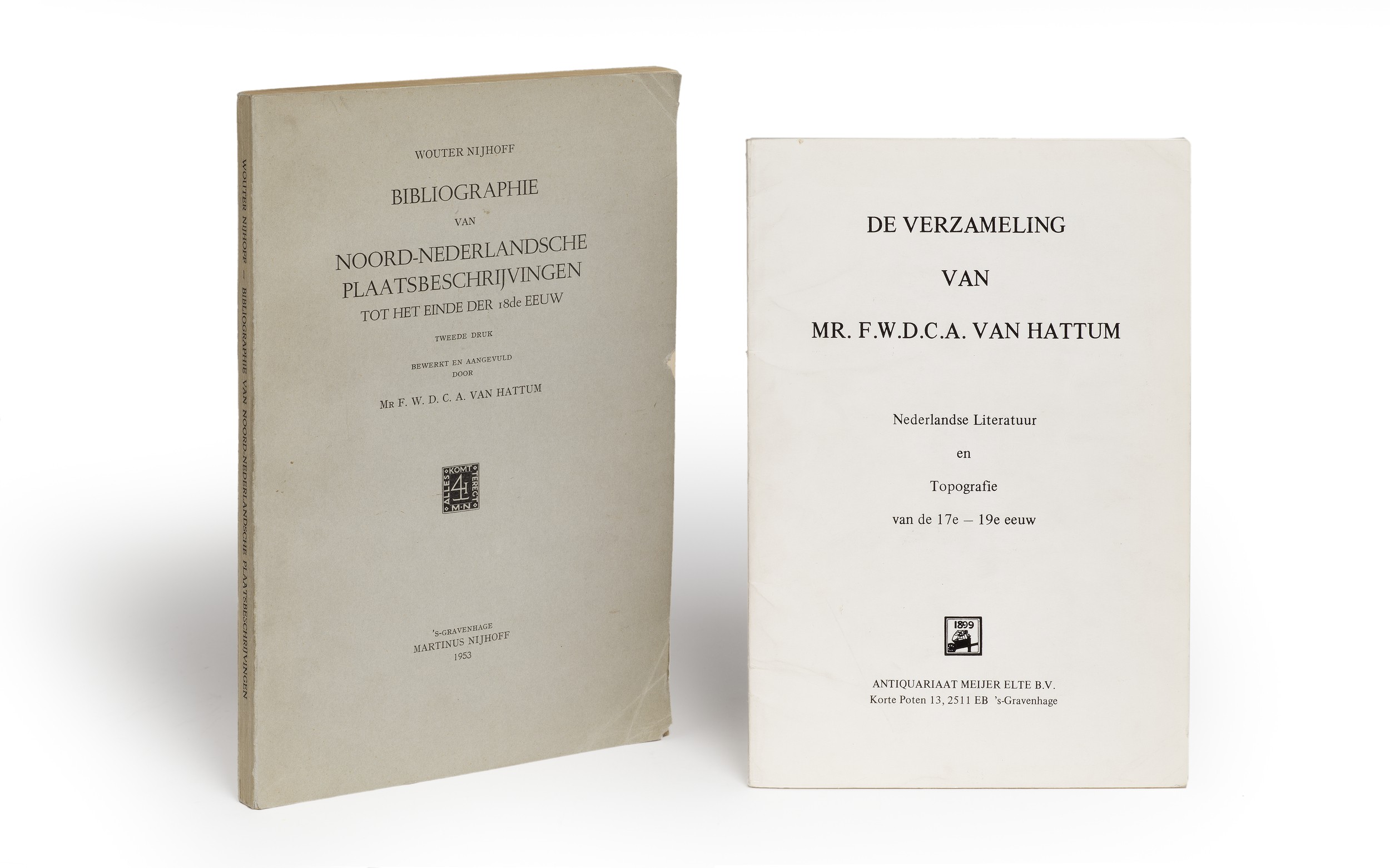 Offered with Antiquariaat Meijer Elte BV (The Hague), [Stock catalogues, numbered series: 45] De Verzameling van Mr. F.W.D.C.A. Van Hattum: Nederlandse Literatur en Topografie van de 17e-19e eeuw. The Hague: Antiquariaat Meijer Elte BV, 1980. (24 cm), 92 pp. Publisher’s printed wrappers. - 235 catalogue entries. Fixed price sale catalogue of the fine private library of Frederik Van Hattum (1900-1979), author of the revised edition of Wouter Nijhoff’s Bibliographie van Noord-Nederlandsche plaatsbeschrijvingen (The Hague 1953) and Oude Hollandse liedboeken uit de 16e en 17e eeuw (Amsterdam 1958). Cf. “In memoriam Frederik W.D.C.A. van Hattum (1900-79)” in Quaerendo, volume 10 (1980), p.173. ¶ Ink date stamp on upper wrapper (12 June 1984).