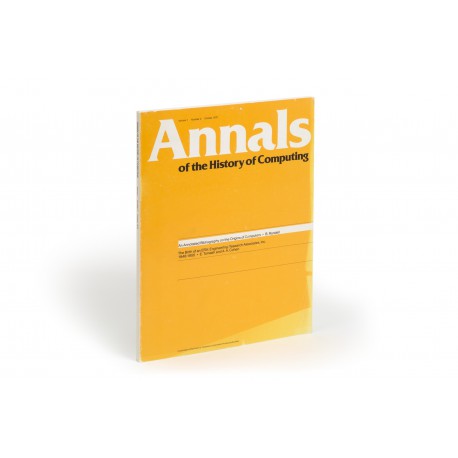 (28 cm), original issue of Annals of the History of Computing, volume 1 (October 1979). Publisher’s printed wrappers. - “The bibliography [pp.81-208] contains nearly 750 annotated and indexed citations to papers, books, and other items relating to the origins of the modern electronic computer. The topics covered range from early digital calculating devices and mechanical automata to the first stored program computers. New entries were added up to June, 1979” (author’s abstract). “This was the first complete bibliography on the subject of computing’s history to be published” (James W. Cortada, A Bibliographic guide to the history of computing, New York 1990, p.13). ¶ Upper wrapper strongly light-stained; otherwise a fine, unmarked copy.