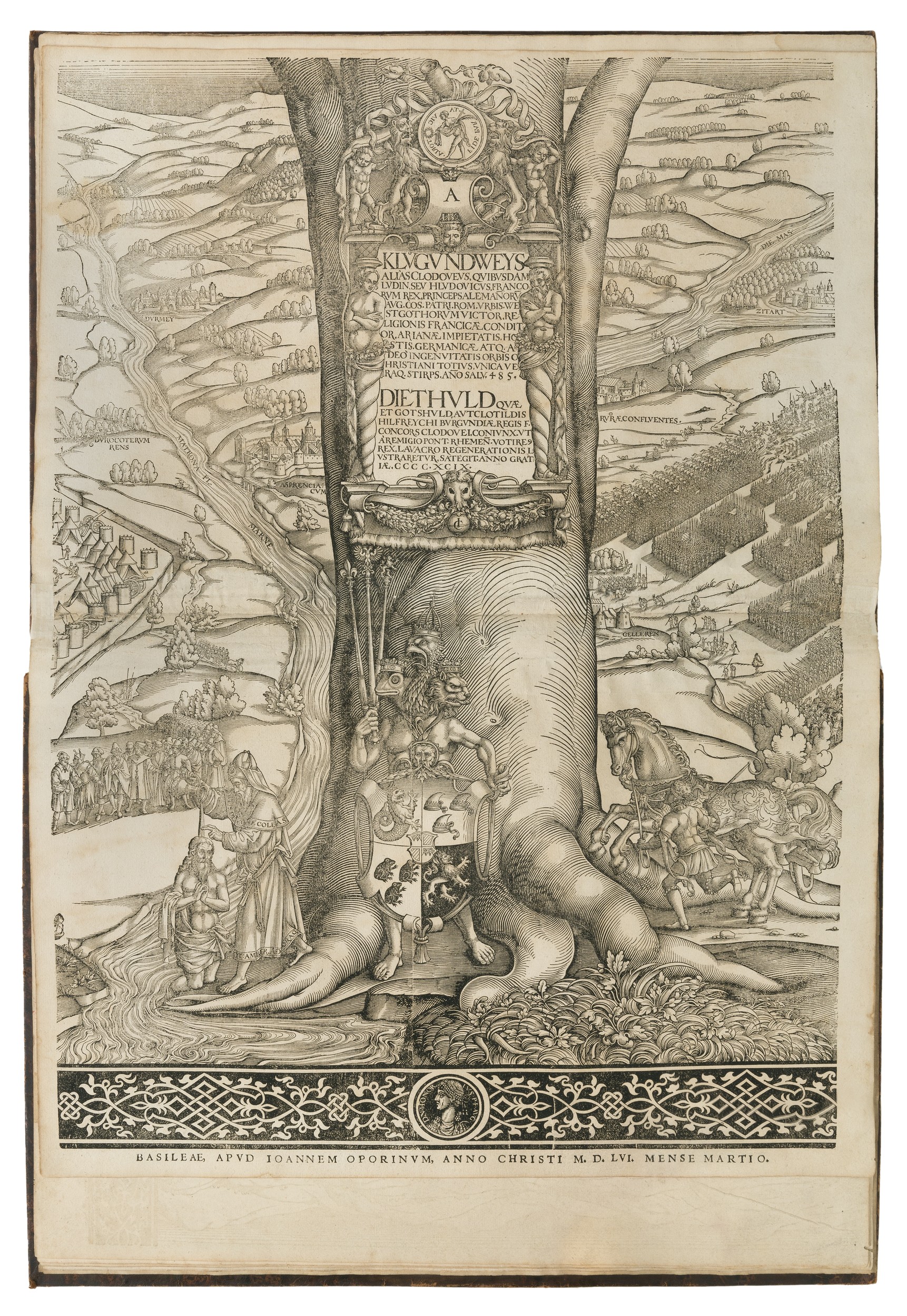 34. Dimensions overall 420 × 132 cm. Historisches Museum Basel, Katalog der Mittelalterlichen Sammlung zu Basel (Basel 1888), p.16 no. 186: ‘Stammbaum Chlodwigs, Holzschnitt, Druck von Johannes Oporinus zu Basel, 1556’ (link). Further details provided by Dr. Raphael Beuing, Wissenschaftlicher Mitarbeiter, Kunsthistorische Abteilung, Historisches Museum Basel, Steinenberg 4, CH-4051 Basel.
