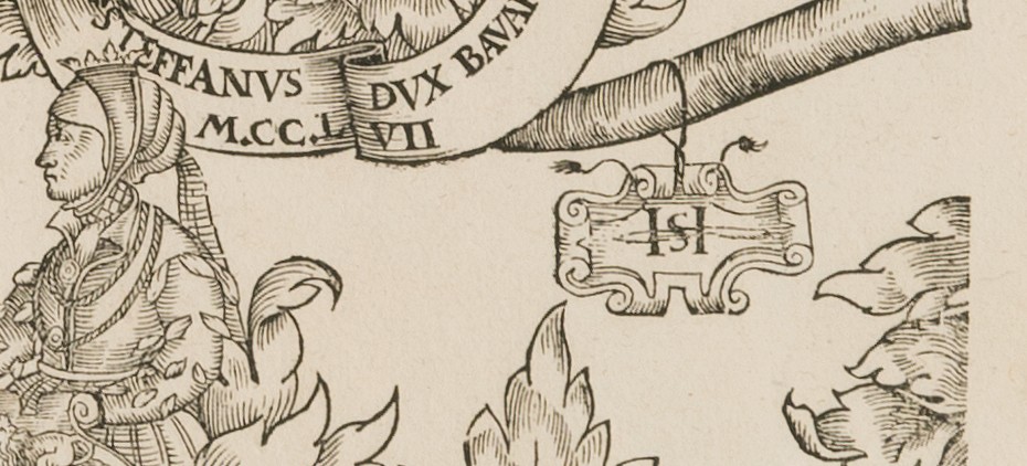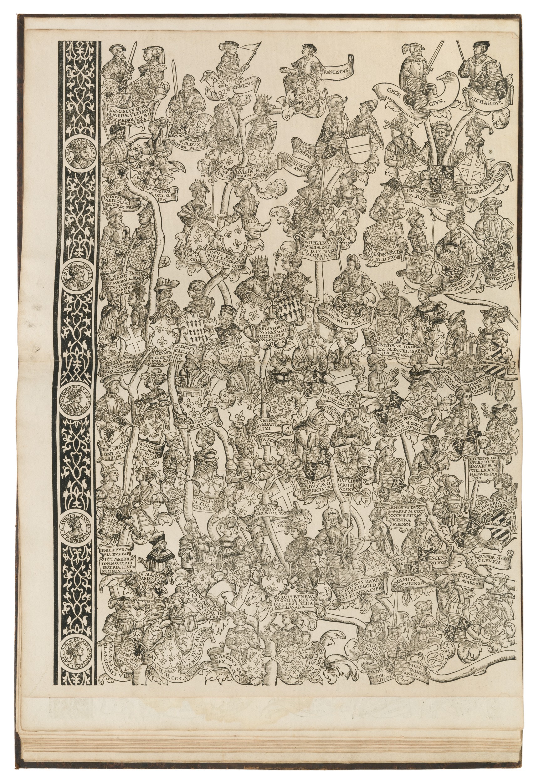 This large format woodcut, printed on twenty-one sheets and when assembled measuring over four metres high, is a family tree of the Wittelsbach dynasty over 1000 years, beginning with the Merovingian King Clovis i (466–511), and culminating with the Elector Palatine Friedrich ii (1482–1556) and his wife Dorothea of Denmark. Also shown are the Bavarian and Palatine branches of the house (from Charlemagne to Charles v) and the Electors of the Rhineland Palatinate. Altogether, 934 half-length portraits and coats of arms are depicted.10 On three sides is an integral border of arabesque ornament featuring 82 bust-length medallion portraits of Roman and Byzantine emperors and Sultan Suleiman the Great, cut on a black ground (width 35 mm).11