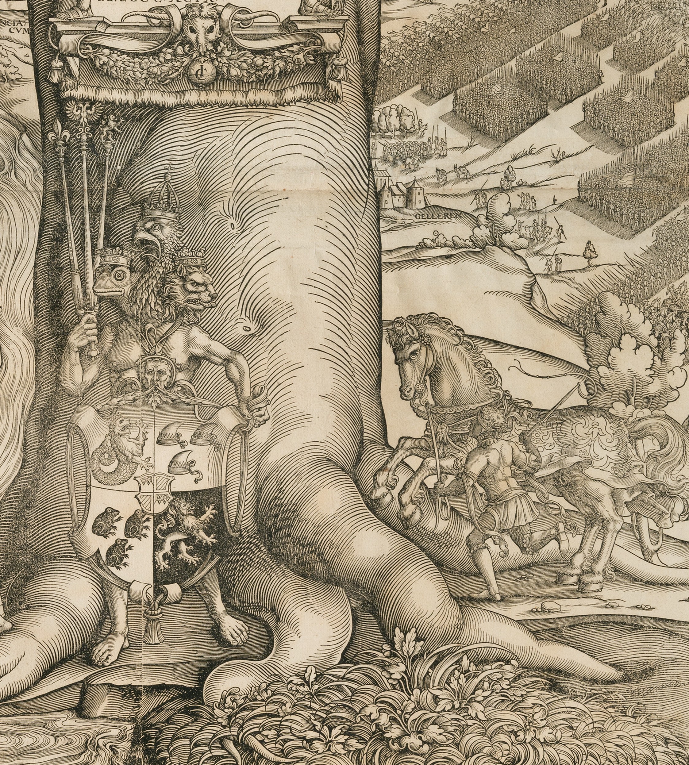 1. Most sheets are printed by two blocks, measuring 19/20 × 58.5 and 24 × 58.5 cm respectively; other sheets appear to be printed from a single block. The number of individual blocks is counted as 42 by Robert Zijlma (in F.W.H. Hollstein, German engravings, etchings and woodcuts 1400–1700. Vol. 15b, Balthasar Jenichen to David Kandel, Blaricum [1986], p.220 no. 3) and by Dieter Beaujean (in F.W.H. Hollstein, German engravings, etchings and woodcuts 1400–1700. Vol. 74, Zacharias Specklin to Hans Ulrich Stampfer ii, Ouderkerk aan den Ijssel 2008, pp.4–8 no. 1).