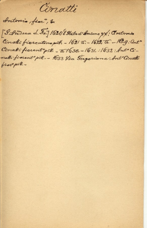 34. Cinatti is recorded in the ‘Stati d’Anime della Parrocchia di San Andrea delle Fratte’ (Archivio Storico del Vicariato di Roma) in 1620–1624, 1626–1627, 1629–1633; see Friedrich Noack, ‘Cinatti, Antonio’ in Allgemeines Lexikon der Bildenden Künstler von der Antike bis zur Gegenwart, edited by Ulrich Thieme and Felix Becker (Leipzig 1912), vi, p.605, based on Noack’s ‘Schedarium der Künstler in Rom’ (http://db.biblhertz.it/noack/data.xml; link); Alla ricerca di ‘Ghiongrat’: studi sui libri parrocchiali romani (1600–1630), edited by Rossella Vodret (Rome 2011), pp.155, 222 no. 175.